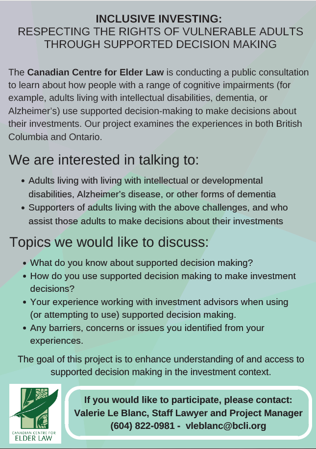 The Canadian Centre for Elder Law (CCEL) continues its consultation interviews with key informants and stakeholders on the use of supported decision-making, in the investment context, by persons living with Alzheimer’s, other forms of dementia or intellectual disabilities. Since October 2018, Project Manager and CCEL Staff Lawyer, Valerie Le Blanc, has interviewed people with lived experience, investment professionals, lawyers, academics and community agencies in British Columbia, Ontario, the United States and internationally.