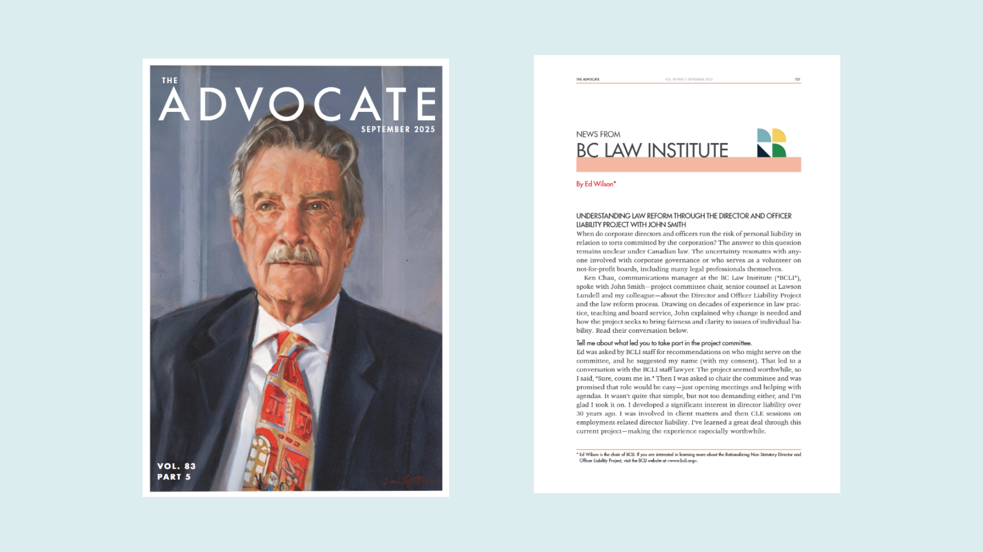 Read the September issue of The Advocate to learn about BCLI’s Rationalizing Non-Statutory Liability of Directors and Officers Project. Project committee chair John Smith, senior counsel at Lawson Lundell, shares his insights on why reform is needed, how the law reform process works, and the project’s efforts to bring fairness and clarity to individual liability.