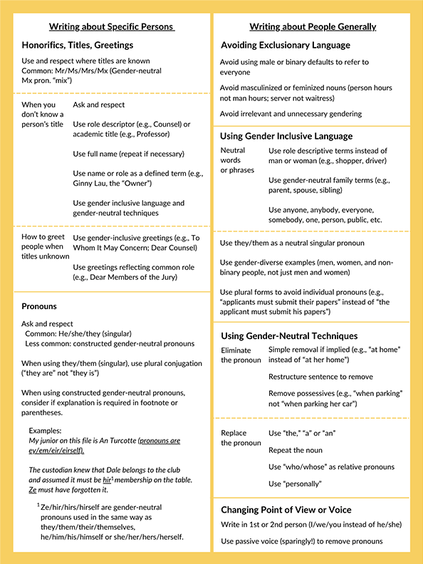 The Guide was developed in response to changes in legal practice and to reflect society’s adoption of a more inclusive view of gender, gender identity, gender expression, and sexual orientation. Although this publication is a writing guide, it also encourages writers to consider the impact of their language choices in relation to other aspects of personal identity.